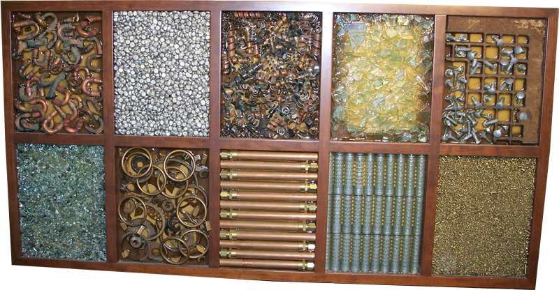Components: MetalarTM, metal, glass, anchors, brass shavings, screws, grid, old curtain rod rings, silver shavings, radiator tube pieces, metal shavings.