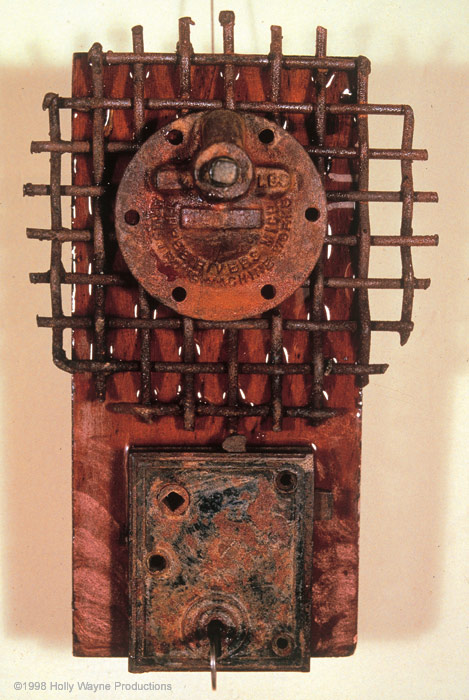 Components: MetalarTM, utility hatch cover, wood, grid, lock & key, etc.