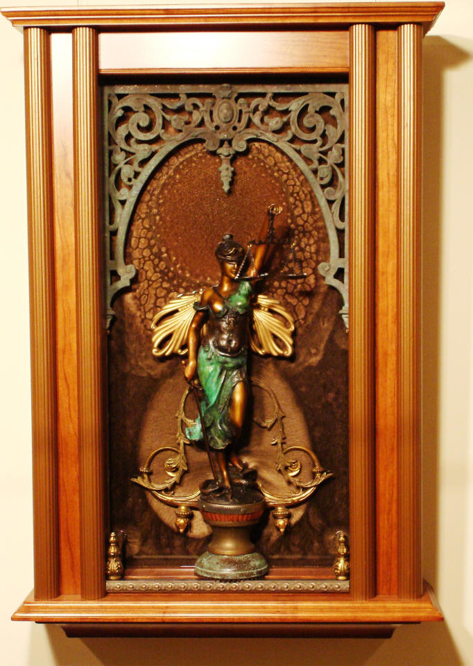Components: Metalar™, Bronze statue by Mayer, gear, antique gas light parts, toilet float, molding, antique brass ornate tongs, vase bases, antique decorative metal, decorative antique curtain rod parts (wings), etc.