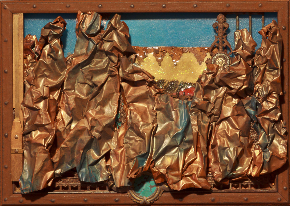 Components: MetalarTM , treated metal, antique paperclip, earring, antique decorative metal, feather, mesh, turquoise