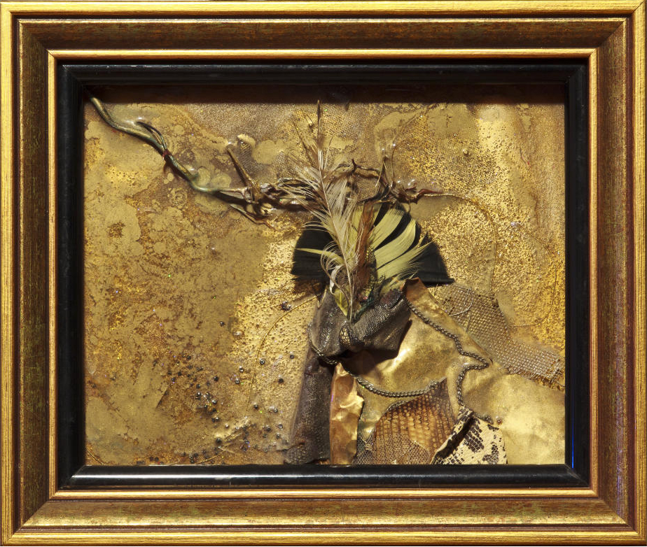 Framed MetalarTM, wood, feather, alligator, chain, burnt metal, net, etc.